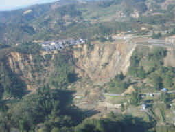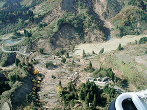| 被災地では地すべりやがけ崩れなどの土砂災害が多発しました。地すべりが発生しやすい新潟県の地質に加え、7月の梅雨前線豪雨や10月の台風23号による大量の降雨によって地盤がゆるんでいたことが被害を大きくしてと考えられています。 空中写真から判読された地すべりやがけ崩れなどの斜面崩壊箇所は、計3791箇所にのぼり、そのうち362箇所では崩壊幅50m以上の大規模崩壊とわかりました。推定される崩壊土砂量は合計で約1億立方メートルにもおよび、1箇所の崩壊土砂量が100万立方メートルを越える大規模崩壊・地すべりは12箇所ありました。土砂崩壊にともない河道閉塞も発生し、中でも山古志村の芋川流域では、河道閉塞により人家が水没・浸水するなどの被害がでました。 |