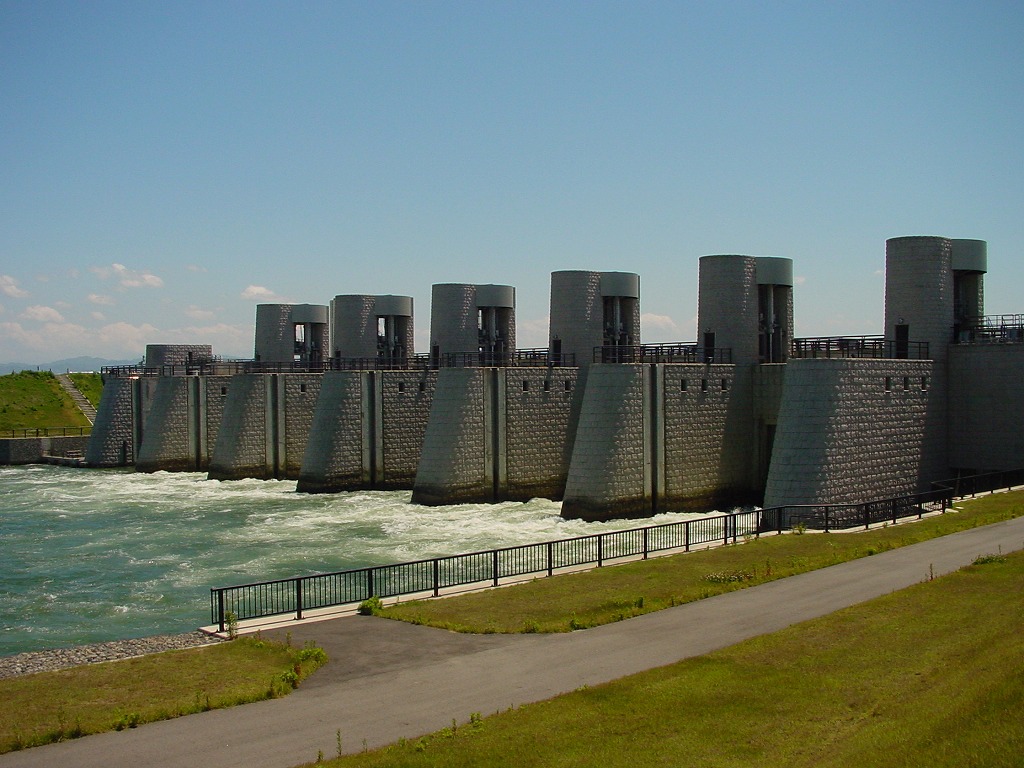 可動堰は、正式名称を「大河津可動堰」と言います。 主に大河津分水路に流す水量をコントロールしており、上流から流れてくる水量によってゲートを開けたり閉めたりします。少し丸い形をしたラジアルゲートを使っており、ラジアルゲートとしては日本一大きい堰です。
