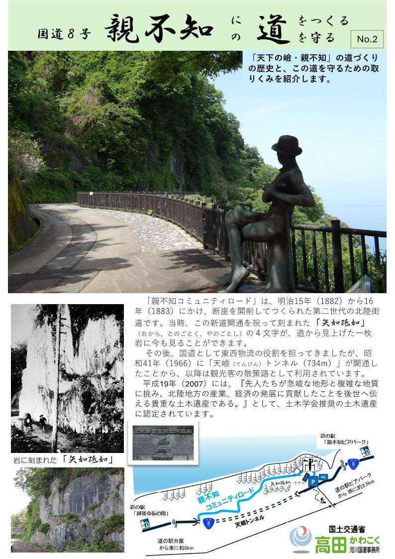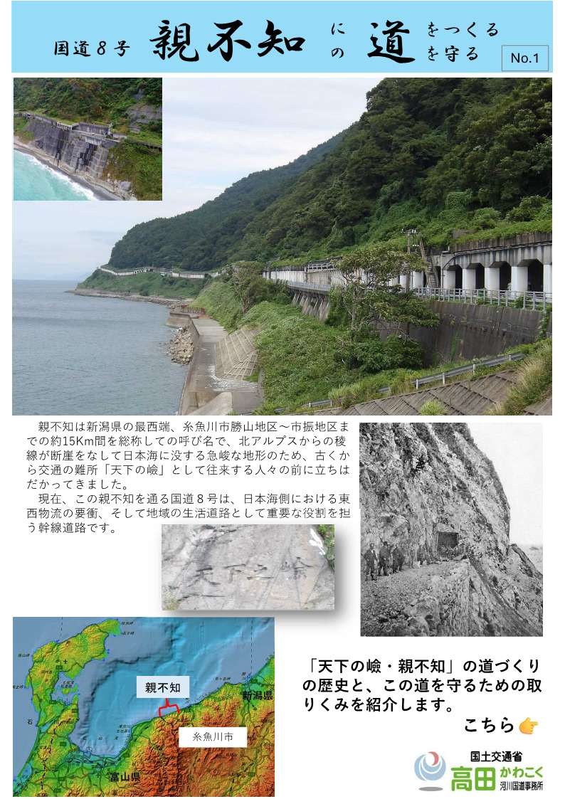 映像と写真でみる河川と道路 道路〔R8・R18〕 R8(昔と今、上越の道) 国道8号柿崎拡幅 国道8号直江津バイパス 国道8号糸魚川東バイパス 国道8号天下の嶮 親不知 国道8号親不知に道をつくる親不知の道を守る No.1 国道8号親不知に道をつくる親不知の道を守る No.2 R18(昔と今、上越の道) 国道18号妙高野尻バイパス 国道18号妙高拡幅 国道18号上新バイパス(渋滞) 国道18号上新バイパス(雪)