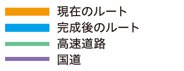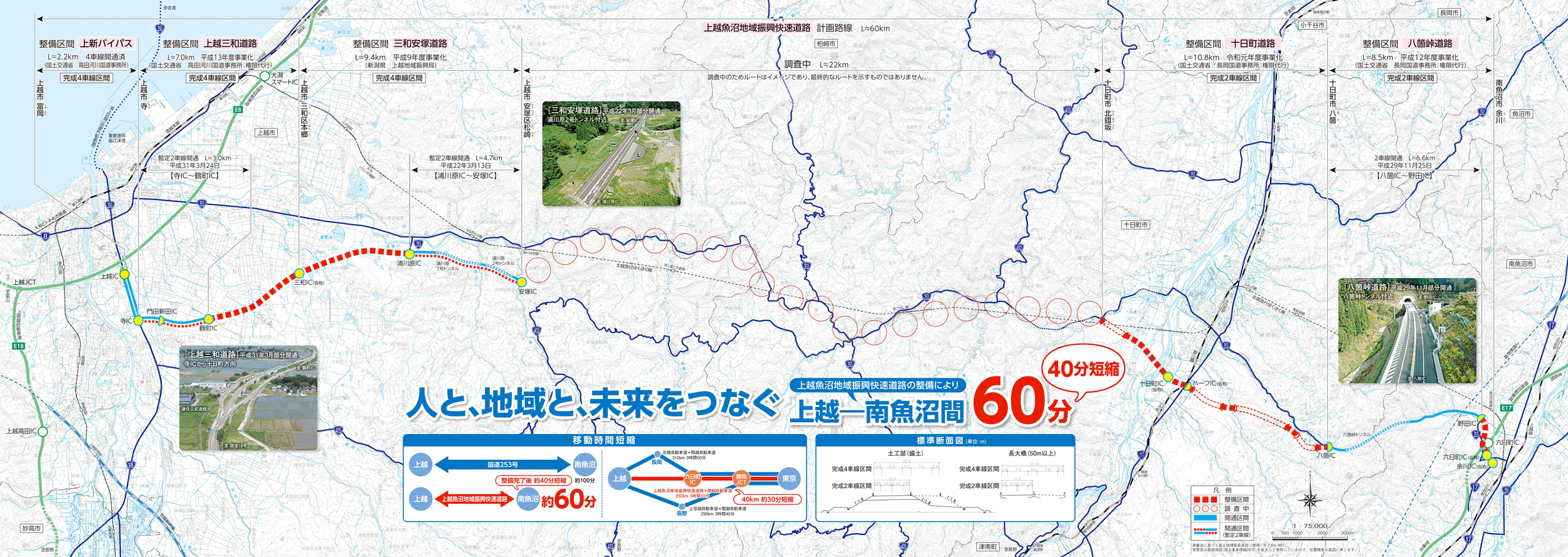 また、起点に位置する北陸自動車道・上信越自動車道及び重要港湾の直江津港と、終点に位置する関越自動車道を連結することにより、交通圏の拡大を図ります。