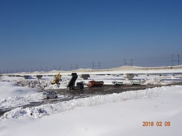 2月8〜9日は連日の大雪が一段落し、気温が上昇して日中は広い範囲での青空となり、市街地道路・駐車場・自宅・企業(商店)等では除雪作業を行っていた。除雪、排除した雪を糸魚川市が姫川河川敷内に設けた雪捨て場所へ雪を積んだトラックが次々と運搬をしていた。(写真参照)