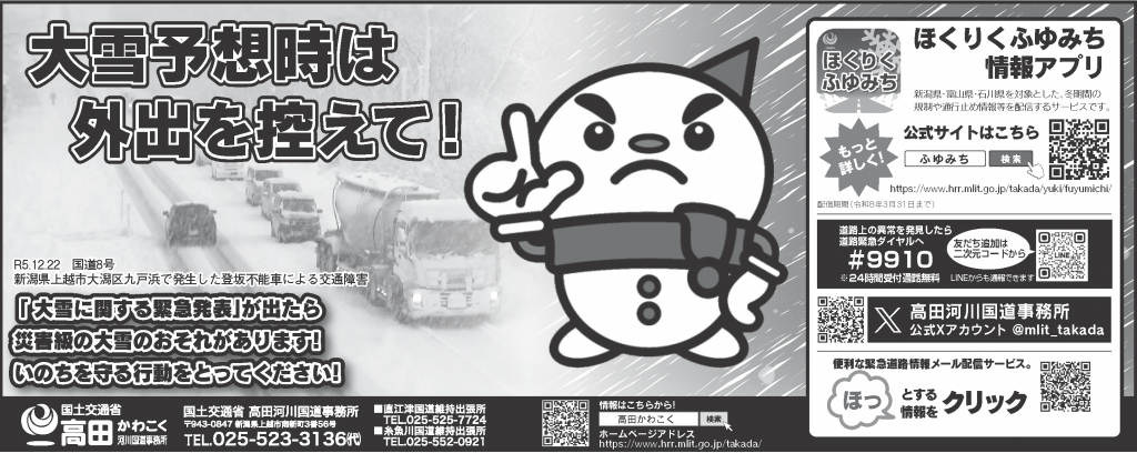 ■早めの冬用タイヤへの交換をお願いします早めの冬用タイヤへの交換をお願いします(PDF容量:482.89 KB) ■除雪作業にご協力をお願いします除雪作業にご協力をお願いします(PDF容量:1.85 MB) ■大雪予報時は外出を控えてください大雪予報時は外出を控えてください(PDF容量:2.64 MB) ■大雪による国道の通行止め時はUターンにご協力を!大雪による国道の通行止め時はUターンにご協力を!(PDF容量:1.34 MB) ■夏タイヤへの交換はもう少し待ってください夏タイヤへの交換はもう少し待ってください(PDF容量:504.96 KB)