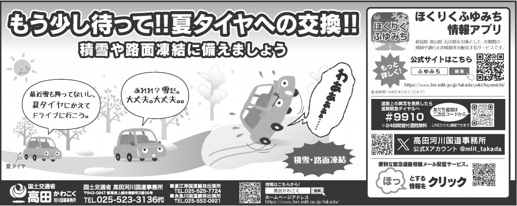 ■早めの冬用タイヤへの交換をお願いします早めの冬用タイヤへの交換をお願いします(PDF容量:482.89 KB) ■除雪作業にご協力をお願いします除雪作業にご協力をお願いします(PDF容量:1.85 MB) ■大雪予報時は外出を控えてください大雪予報時は外出を控えてください(PDF容量:2.64 MB) ■大雪による国道の通行止め時はUターンにご協力を!大雪による国道の通行止め時はUターンにご協力を!(PDF容量:1.34 MB) ■夏タイヤへの交換はもう少し待ってください夏タイヤへの交換はもう少し待ってください(PDF容量:860.33 KB)
