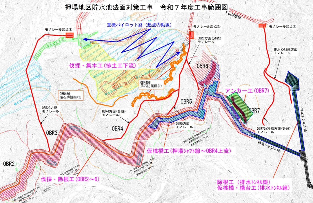 工事用資機材は、国道471号線→市道北豆谷線→林道下山線を通行して搬入します。 また6月までは仮桟橋工資材を上百瀬地区仮置き場から現場へトラック運搬します。 交通安全マナーの徹底と運行ルール遵守に努めてまいりますので、地元の皆様にはご理解・ご協力をよろしくお願いいたします。