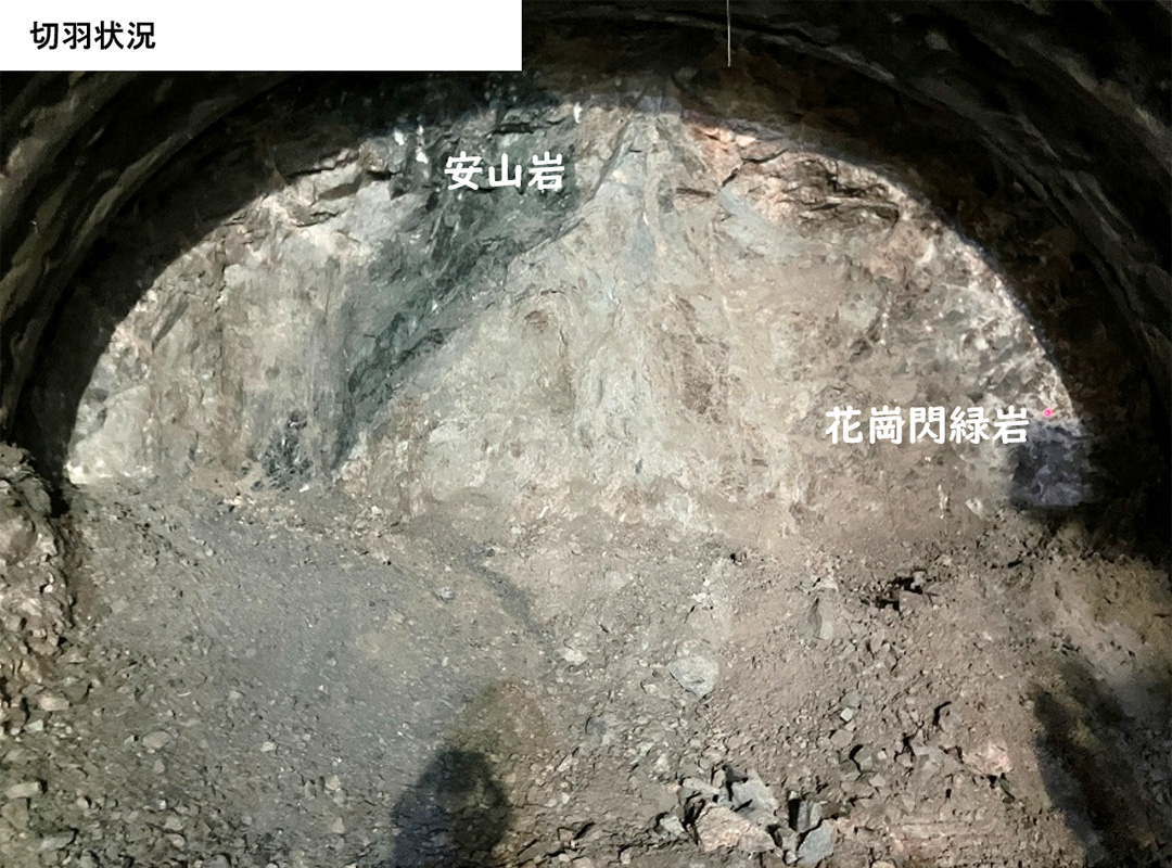 貫入岩である安山岩と花崗閃緑岩が混在している地山が継続しており、境界部が崩れやすい状況になっています。
