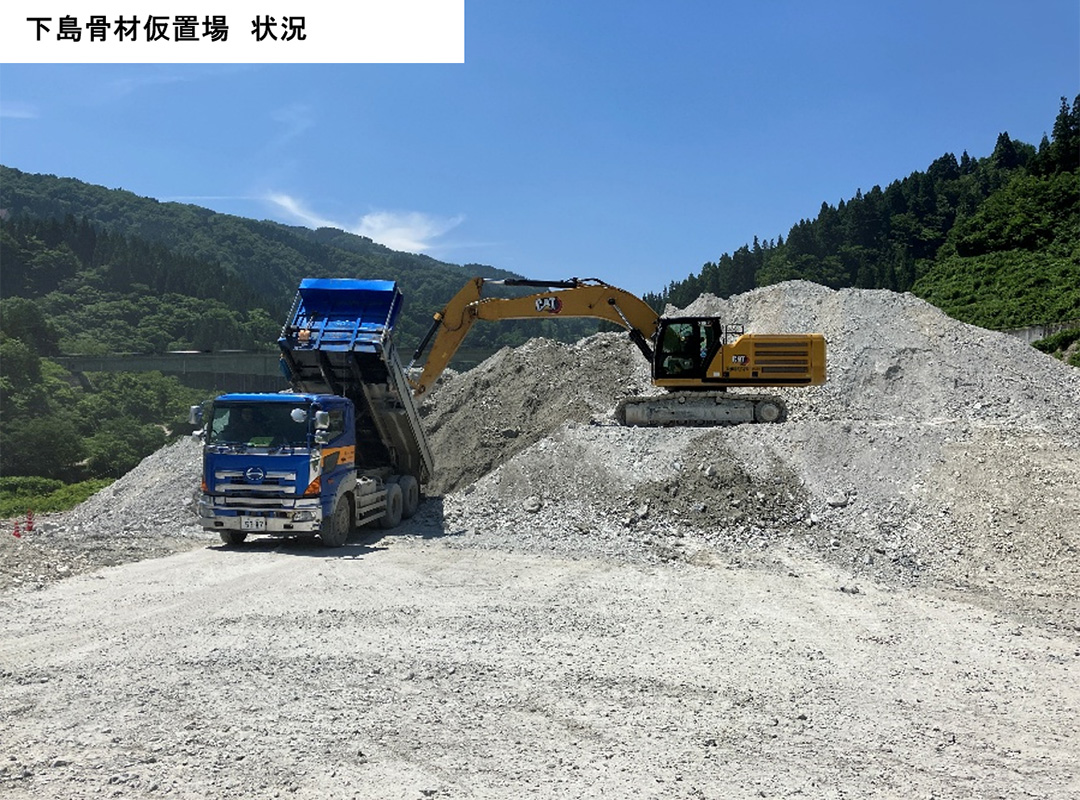 トンネル掘削により発生した掘削ズリは、下島骨材仮置場へ運搬し利賀ダム本体事業に転用されています。