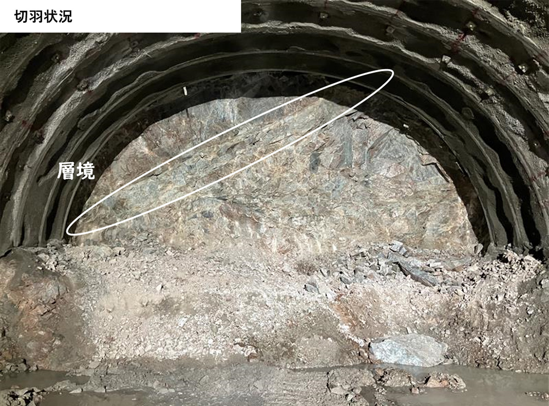 現在の切羽の写真からは、断層部分で層境がずれている(左側の層境が断層を境に下側に移動)ことが顕著に表れています。