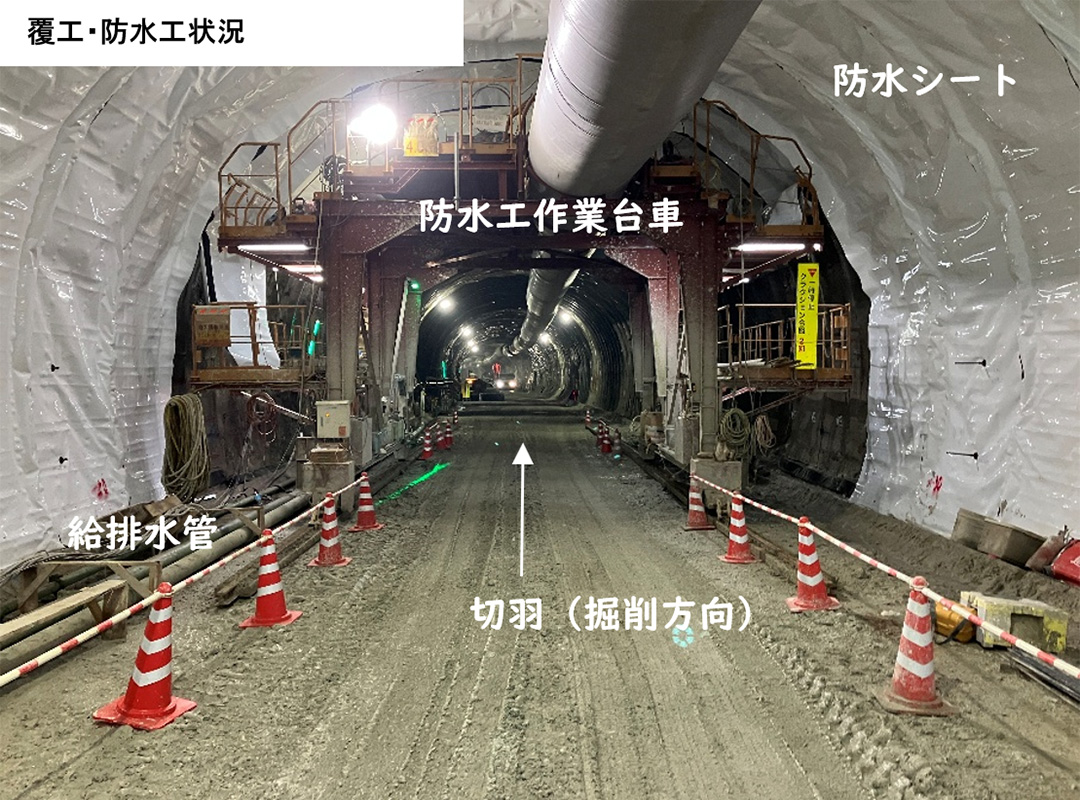 覆工・防水工は、トンネル先端部(切羽)から後方500mの位置で施工しています。