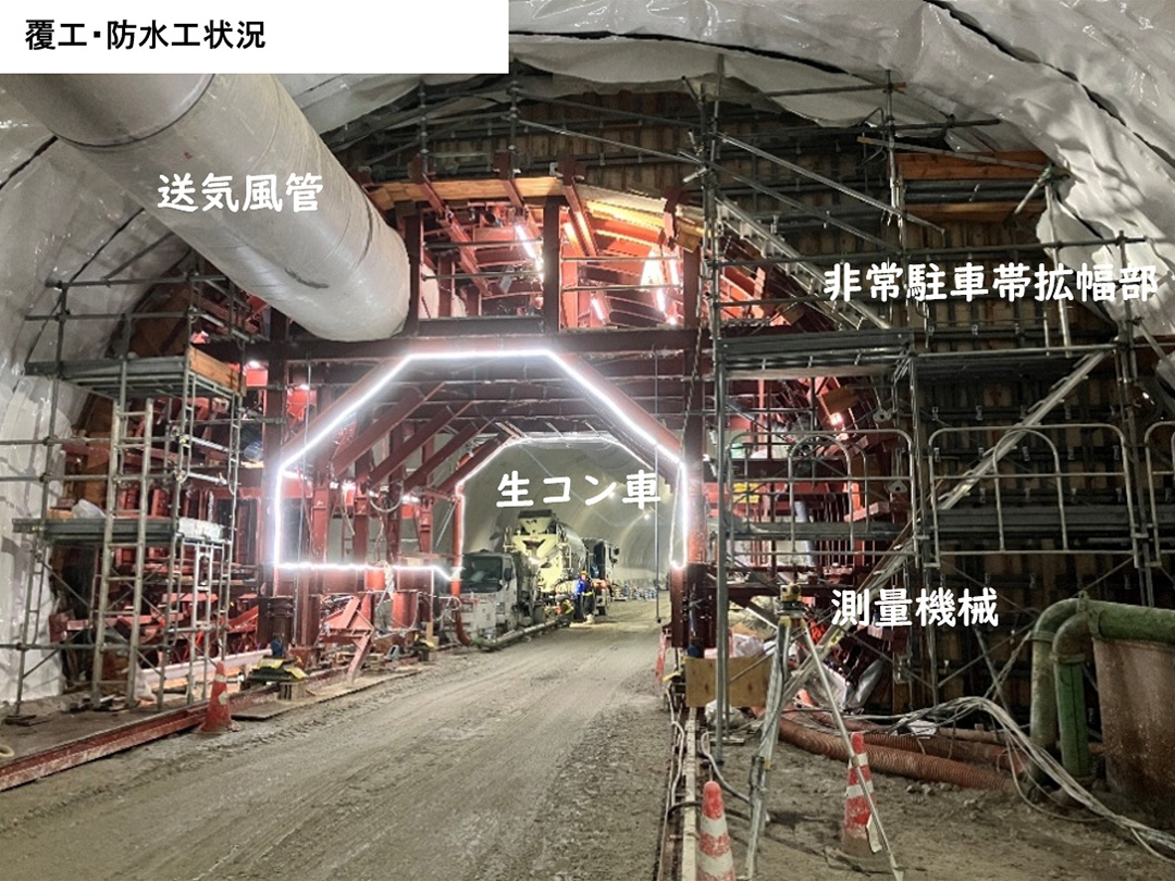 覆工は、開始から1,860mに達しました。現在は非常駐車帯拡幅部の打設を実施しています。通常断面から拡幅断面に変化する場所であり偏荷重が型枠材に載荷される為、測量機械を用いて計測しながら施工を行っています。