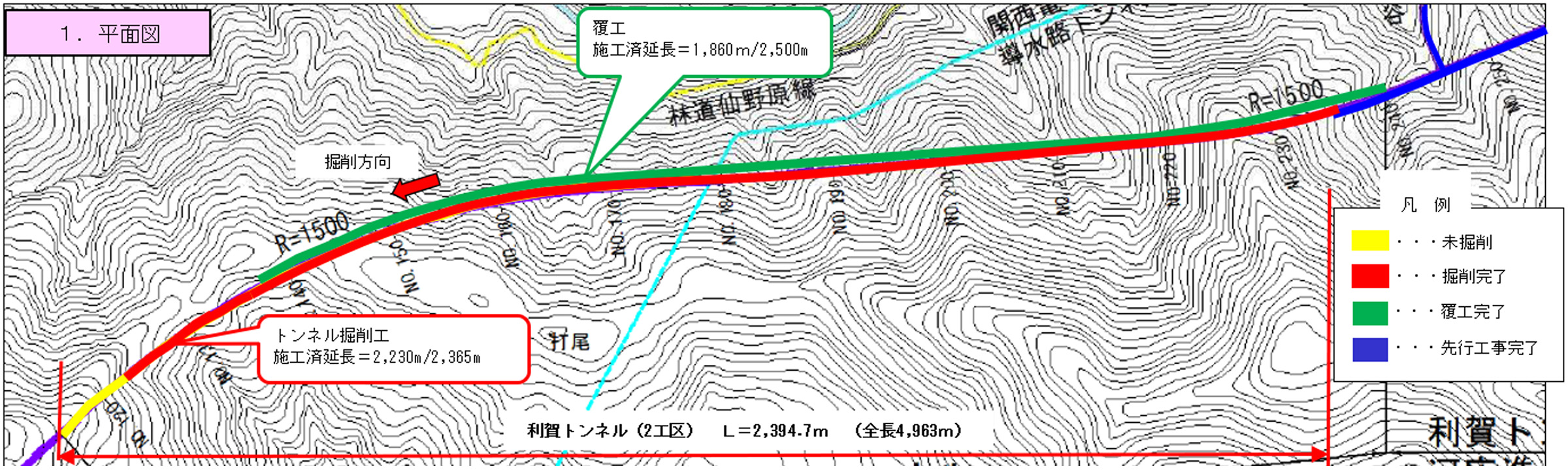 トンネル掘削は掘削開始から2,230mに到達しました。地山の状態は、極めて崩れやすい状態が継続しており、慎重に掘削を進めております。