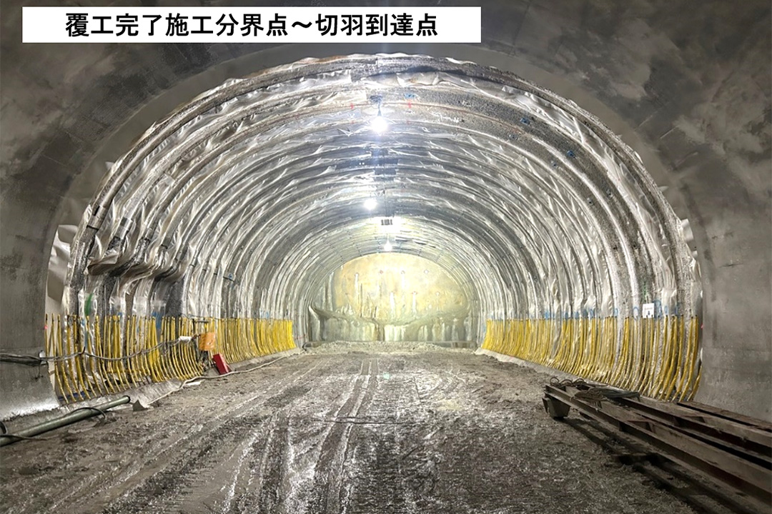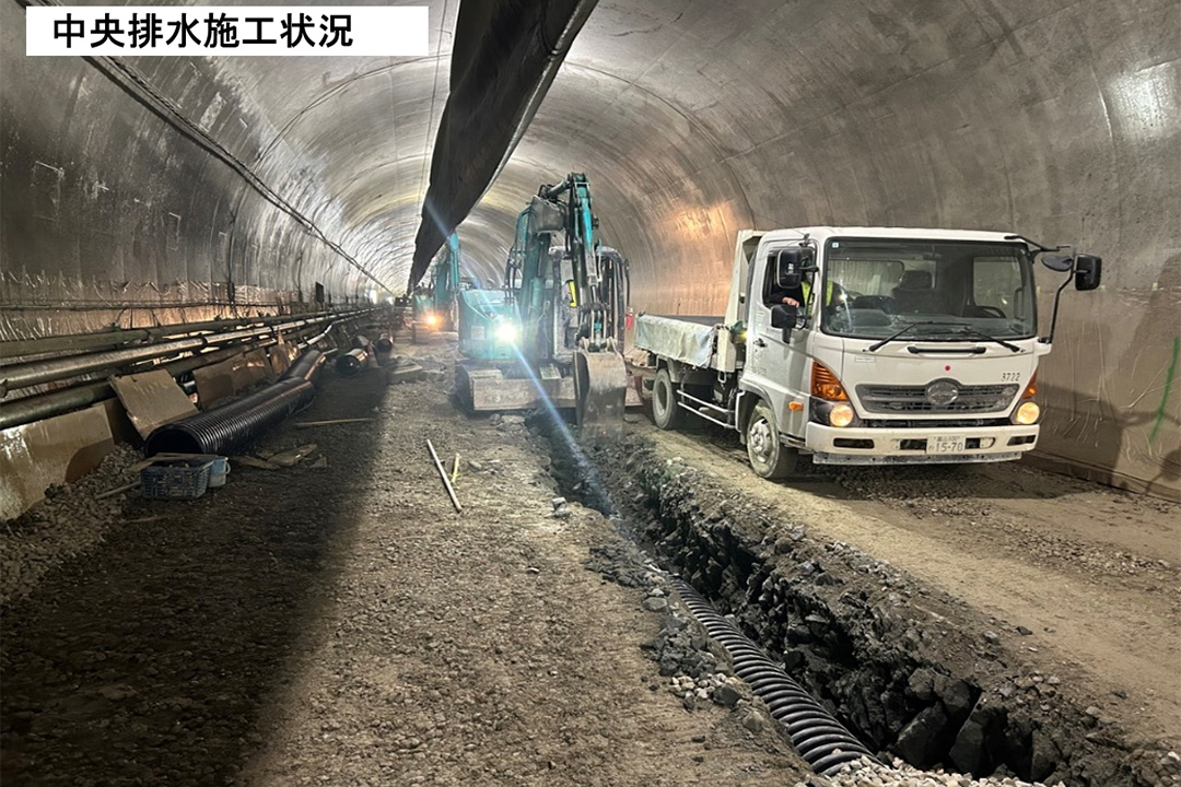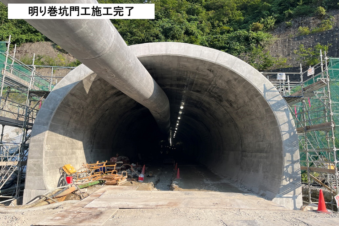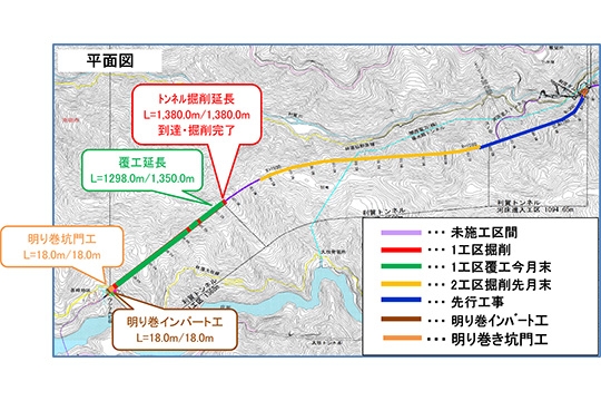 7月末時点、覆工・防水工は1,280.0m/1,368.0m、中央排水工は1156.0m/1368.0mまでの施工が完了しました。