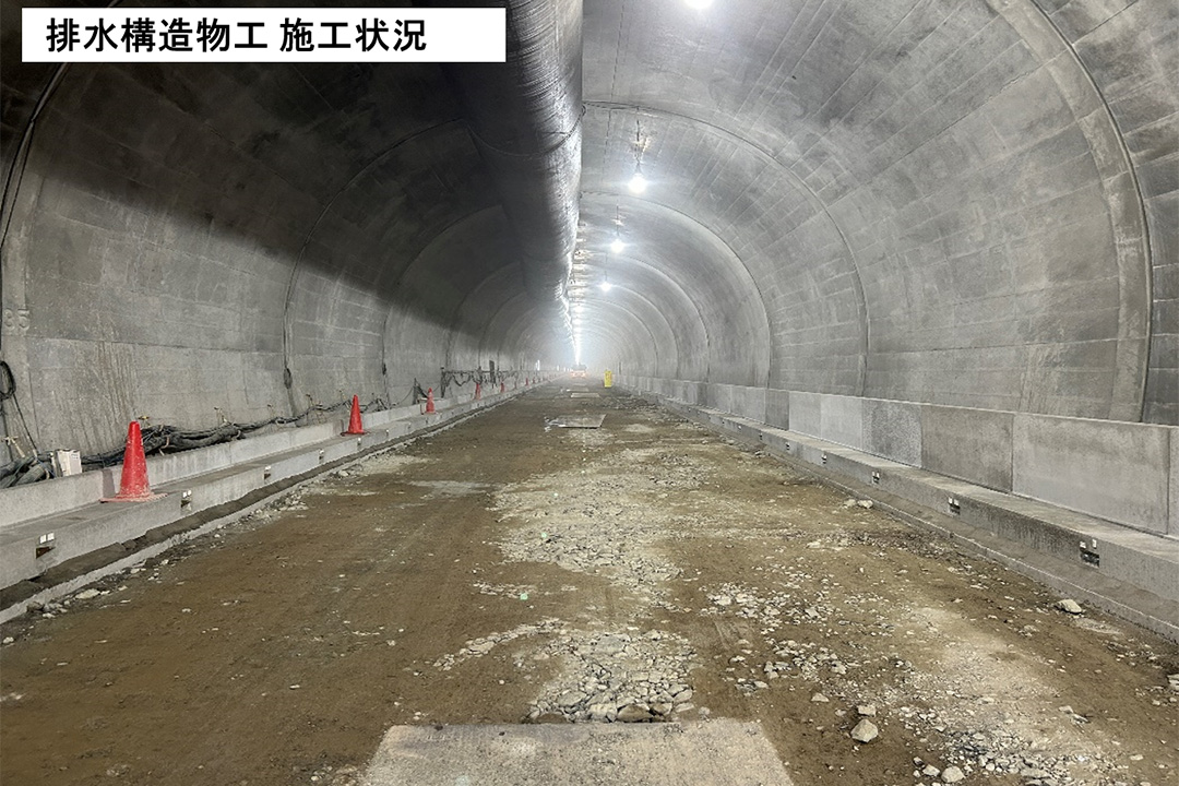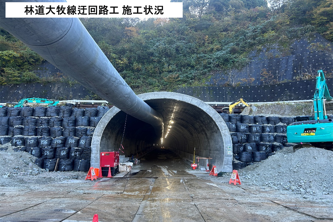 10月末時点、覆工・防水工は施工完了、排水構造物工はL側 860m/1368m・R側 600m/1368mまで施工完了、坑外では林道大牧線迂回路工の盛土・大型土嚢設置を行っています。