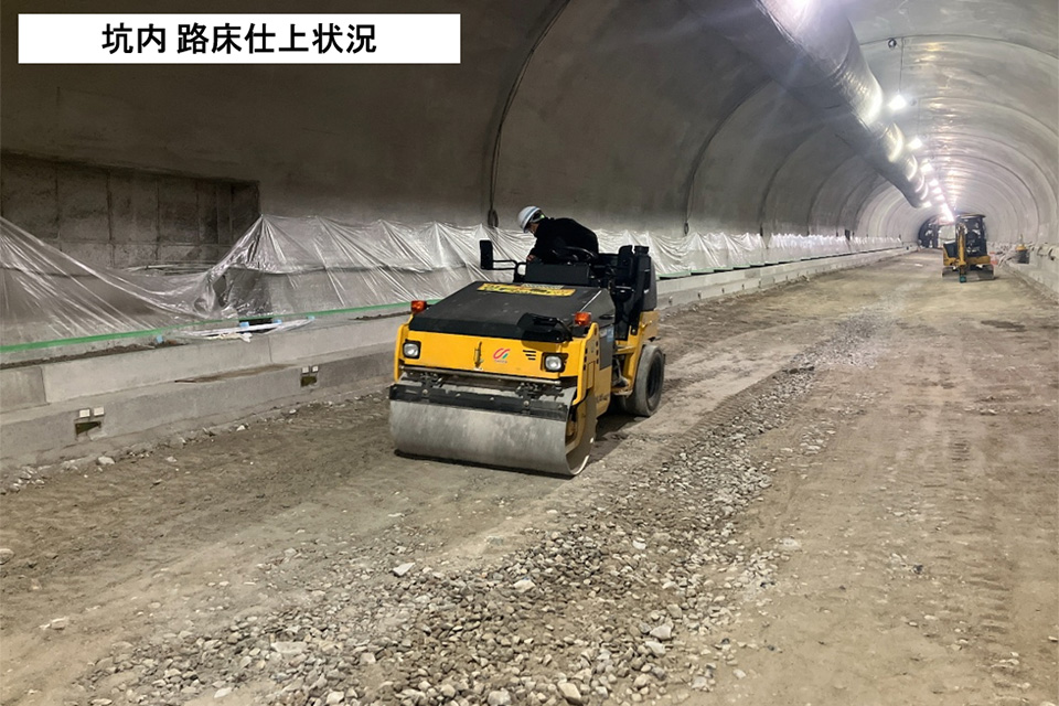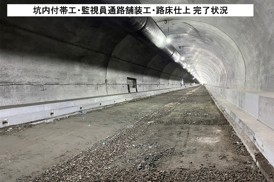 1月は坑内では坑内付帯工・監視員通路舗装工が完了、坑外では林道大牧線復旧工、排水構造物工を行いました。