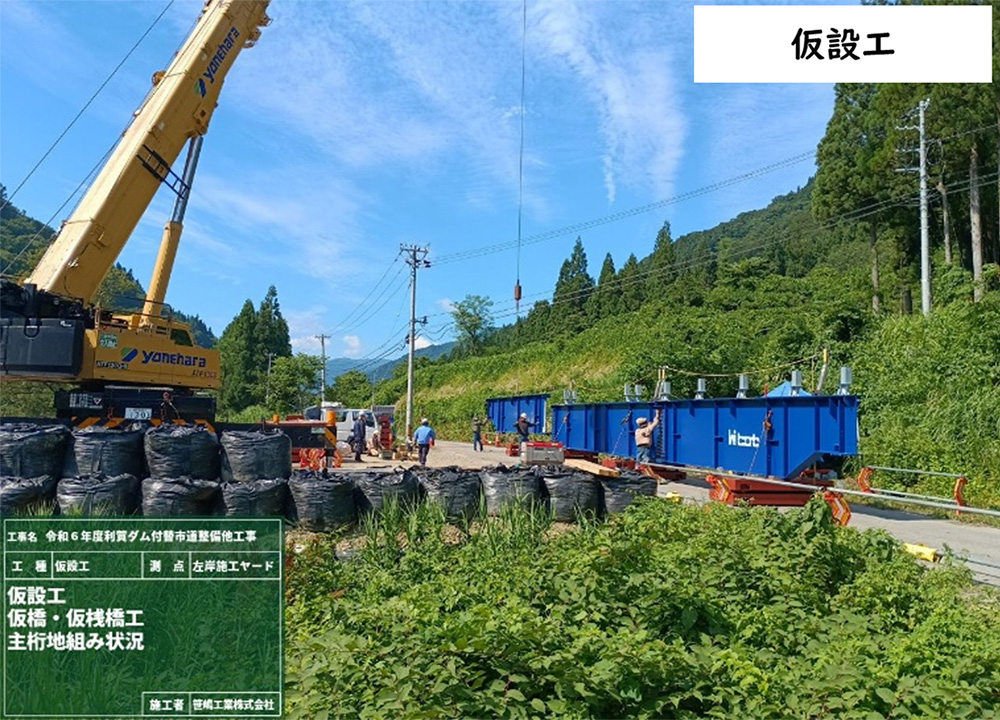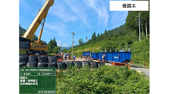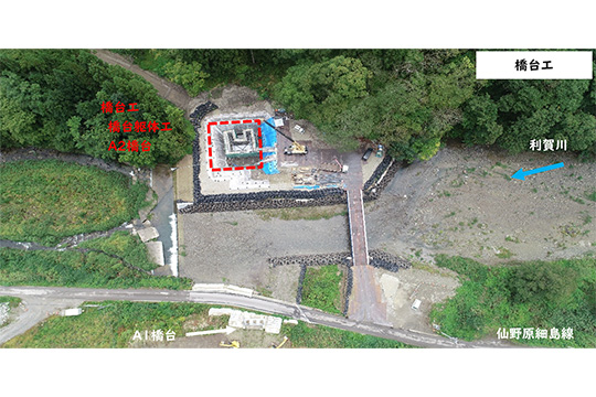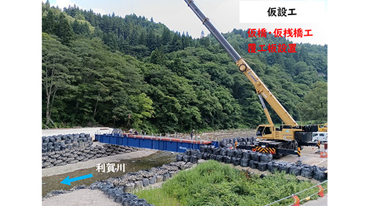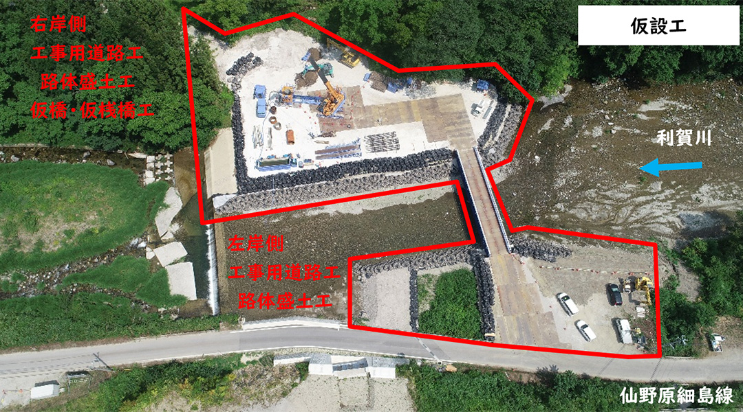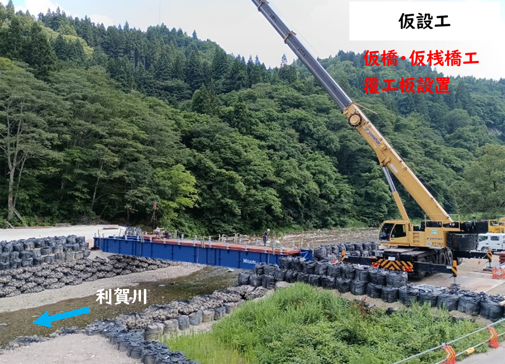 利賀川右岸側の施工ヤード(A2橋台施工ヤード)と左岸側施工ヤードを構築し、右岸と左岸をつなぐ仮桟橋を施工しました。
