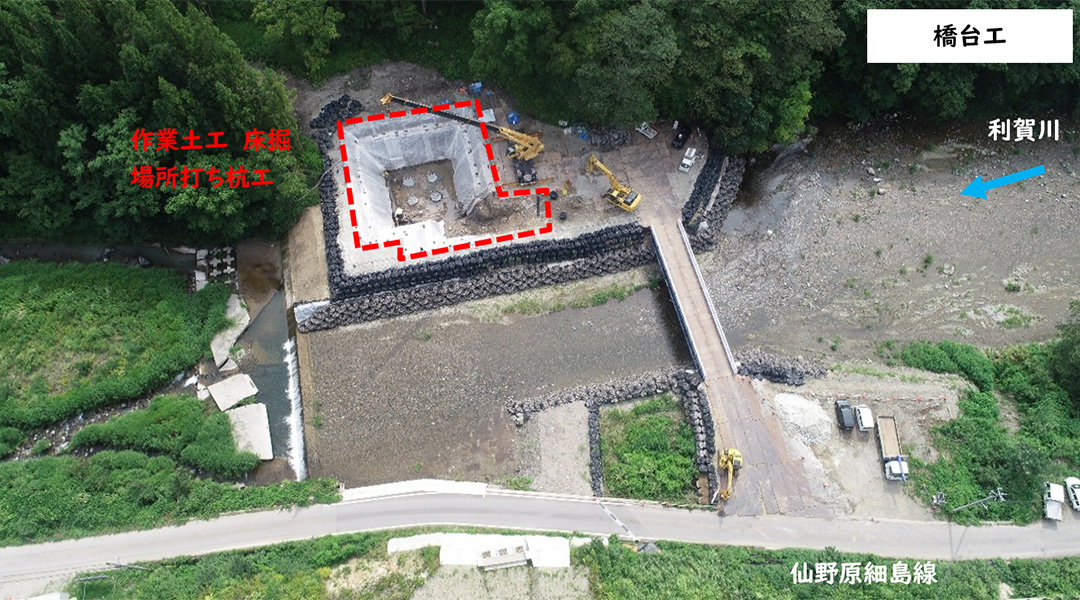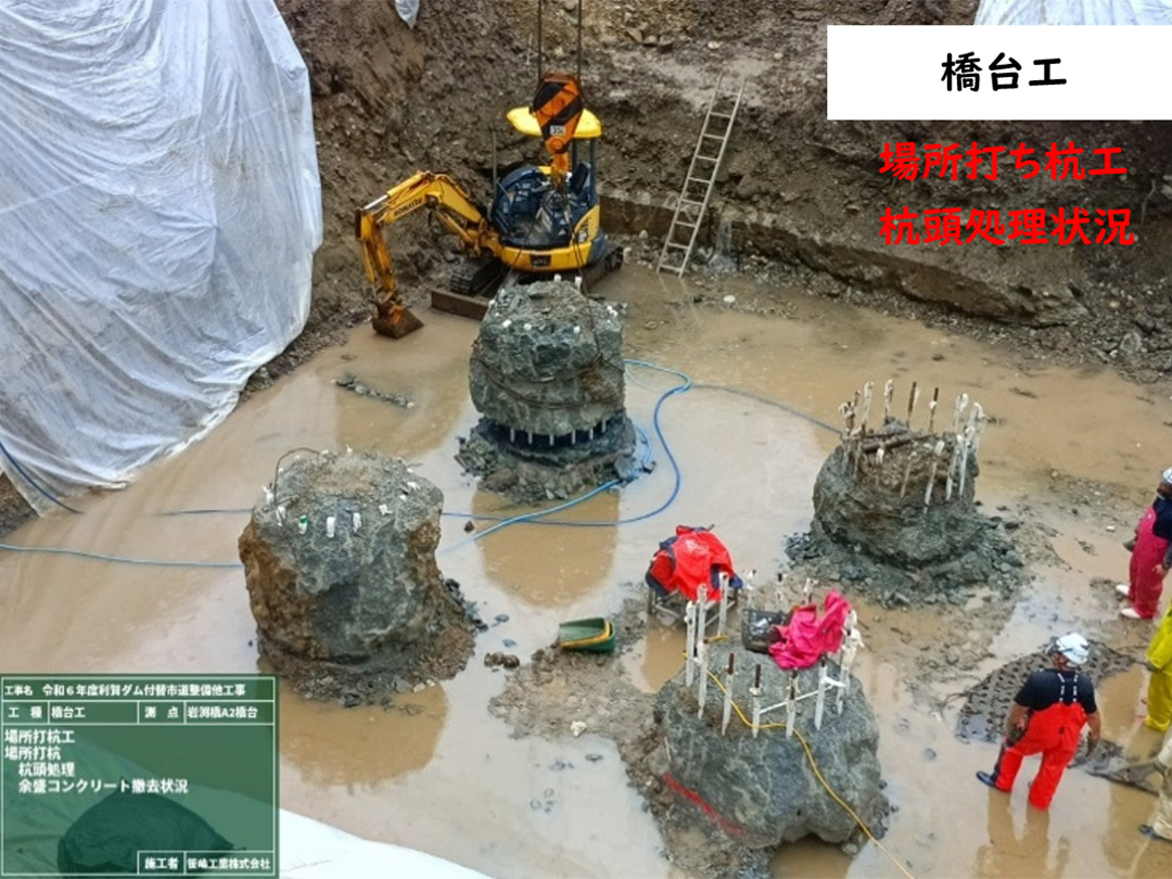 夏季休暇明けは橋台工(A2橋台)の床掘作業を行い、下旬には場所打ち杭の杭頭処理を行いました。