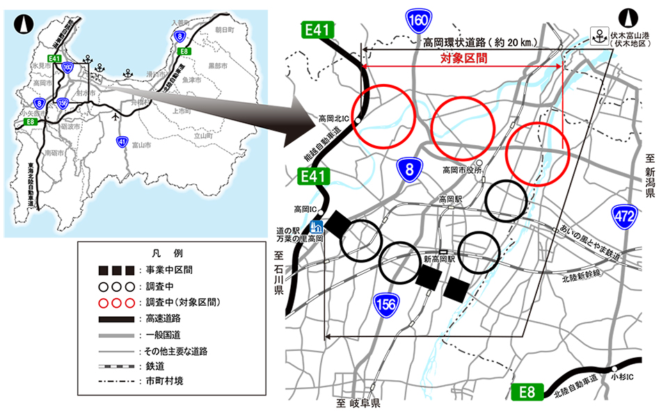 高岡環状道路は、能越自動車道と一体で富山県高岡市の環状ネットワークを形成する計画延長約20kmの高規格道路です。