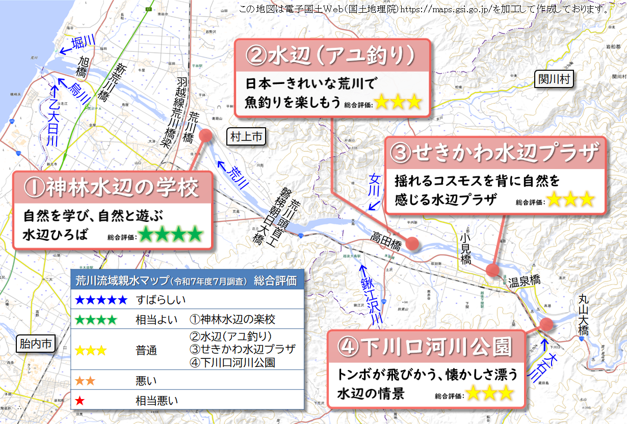| ◆「川の通信簿」とは 国土交通省では、全国236河川を対象に河川敷の親しみやすさや周辺環境の豊かさについて、一般利用者から評価していただく調査、“川の通信簿”を実施することを決めました。 本調査は令和元年に続いて6回目。河川敷等施設及び川原や護岸について、その利用においてご評価いただき、今後の水辺環境及び施設の改善に生かすことを趣旨とした“アンケート調査”です。 調査では「豊かな自然を感じるか」「水はきれいか」「散歩はしやすいか」「案内板はわかりやすいか」など環境や利用の側面からの15項目について「良い」「普通」「悪い」の三段階で、また総合評価も5段階で評価します ◆「川の通信簿」in荒川 荒川では令和7年7月に実施しました。荒川流域で活動されている市民団体・漁協の方々と一緒に荒川を歩き、評価していただきました。 |